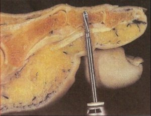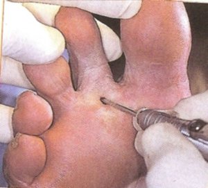 Exostosis excisions may be performed using percutaneous incisions on any hyperostosis on the phalanx such as on the distal aspect of the digit, at the distal IPJ, the proximal IPJ either dorsal or medial or lateral.